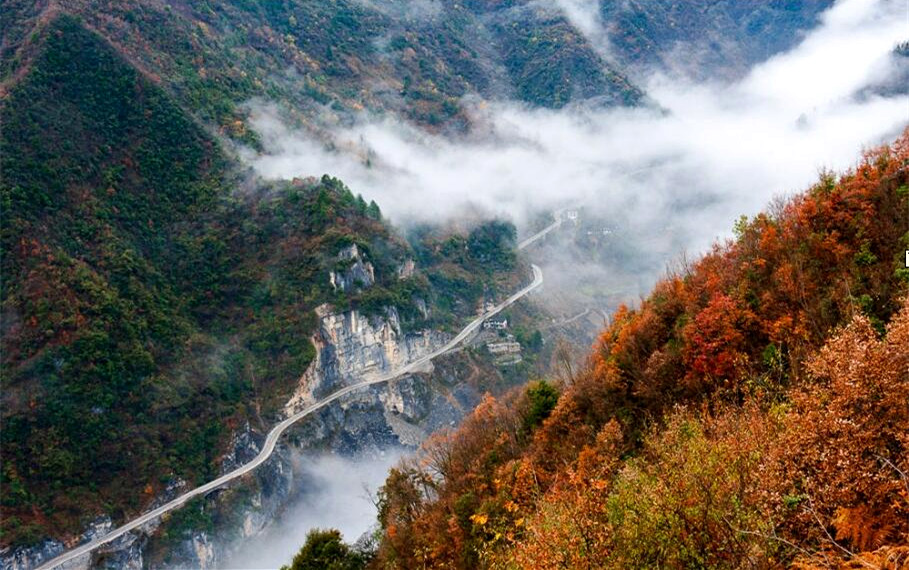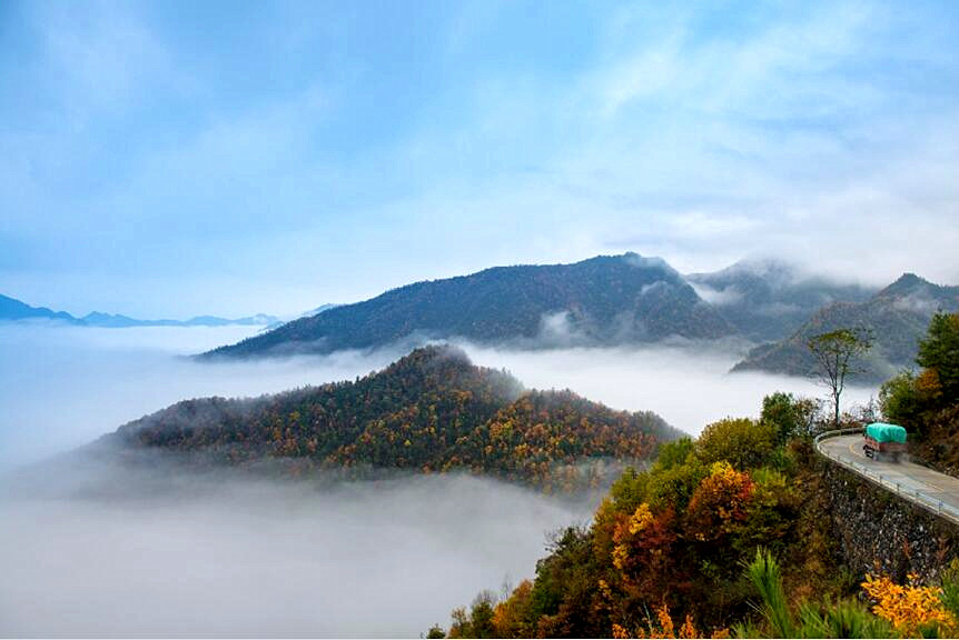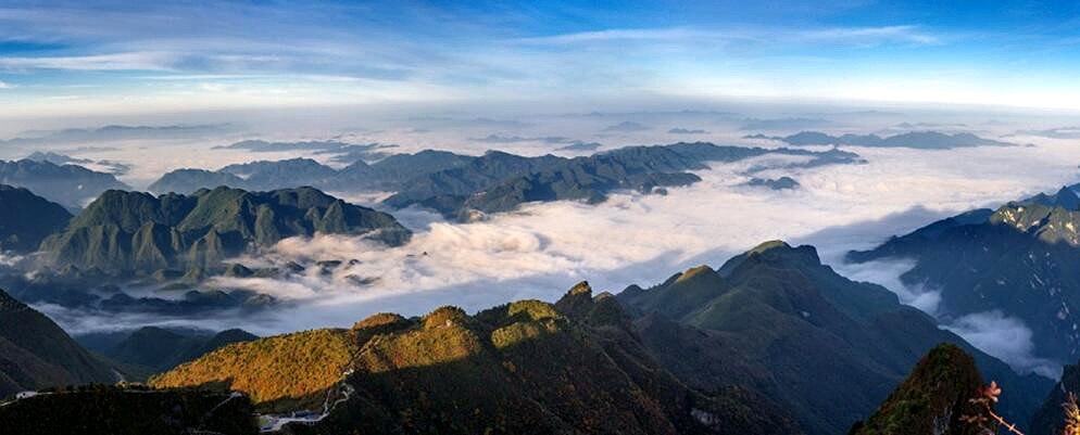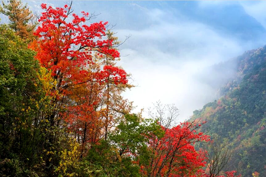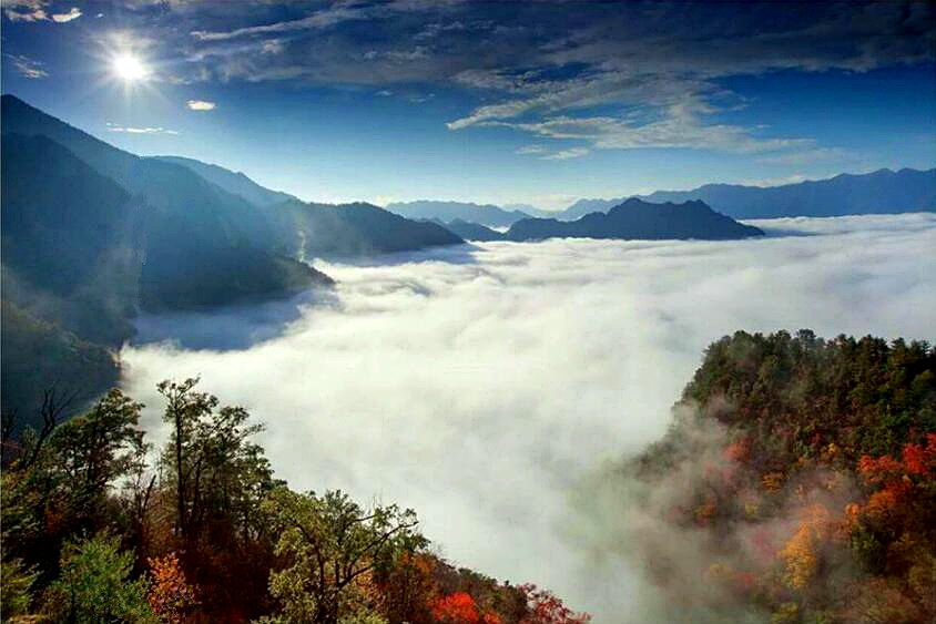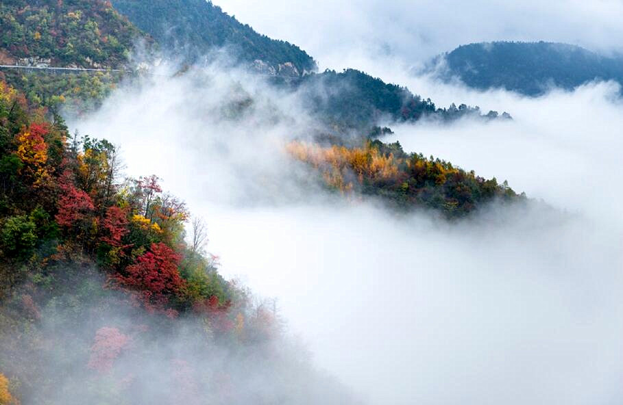 城口縣地處重慶最北端、大巴山腹心地帶、南北氣候過渡帶,森林覆蓋率居全市第一,擁有近4000種植被。大巴山由于海拔高,氣候、植被存在明顯的立體差異,每到深秋時(shí)節(jié),近4000種植物競(jìng)相抹色,爭(zhēng)奇斗艷,整個(gè)大巴山呈現(xiàn)出赤橙黃綠青藍(lán)紫一幅幅層林盡染般的山水景色。加之,城口不少大山海拔在2000米以上,秋冬時(shí)分極易看到云海。此時(shí),霧海與彩山交相輝映,波瀾壯闊、浪漫多情,讓人不禁發(fā)出感嘆:此景只應(yīng)天上有,人間難得幾回見。