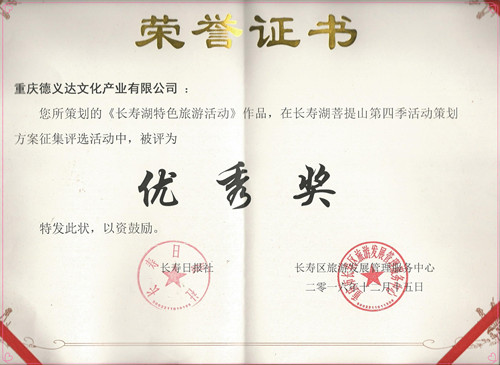 2017年1月4日,“長(zhǎng)壽湖菩提山活動(dòng)策劃金點(diǎn)子”評(píng)選會(huì)議在長(zhǎng)壽舉行。由重慶旅游與文化研究院旗下公司重慶德義達(dá)文化產(chǎn)業(yè)有限公司提交的策劃方案,在與全國(guó)40多套方案的角逐中榮獲優(yōu)秀獎(jiǎng)。