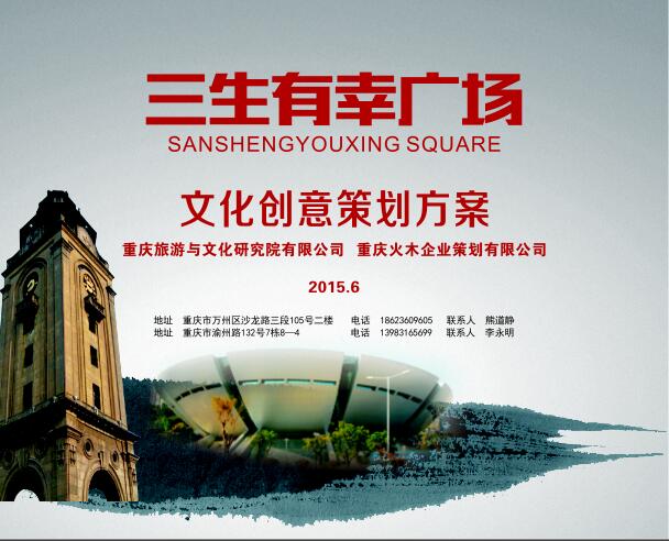 近日,由重慶旅游與文化研究院承擔(dān)的《重慶萬(wàn)州三生有幸廣場(chǎng)文化創(chuàng)意策劃方案》完稿。本創(chuàng)意方案,本著“人文地標(biāo)與城市形象同塑,文化挖掘與活化顯化統(tǒng)籌,山水園林與文化小品互涵”原則,從三生有幸的傳說(shuō)故事中抽象提煉出若干文化元素,提出三生有幸廣場(chǎng)的功能定位、園林綠化、文化小品、文化旅游創(chuàng)意,以確保實(shí)現(xiàn)萬(wàn)州區(qū)委區(qū)政府重點(diǎn)打造三生有幸廣場(chǎng)的既定工作意圖。