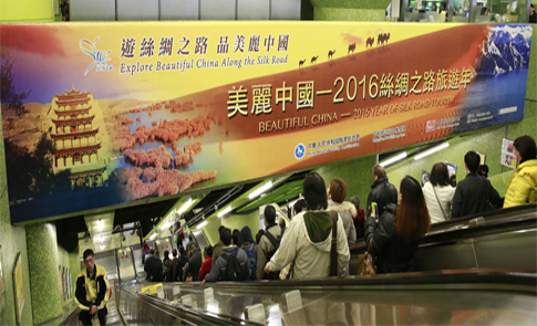 1月26日,一幅長(zhǎng)14.5米、高2.5米,面積達(dá)36平方米,以“美麗中國(guó)—2016絲綢之路旅游年”為主題的大型廣告在香港灣仔地鐵站閃亮登場(chǎng)。大漠、駝隊(duì)、雪山、海洋等元素配以黃沙和藍(lán)海底色,組合成一幅絲路風(fēng)景的寫(xiě)意圖畫(huà),形成了強(qiáng)大的視覺(jué)沖擊力,吸引了過(guò)往乘客拍照留念。